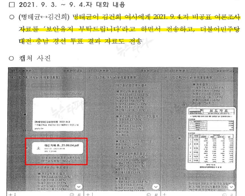 다만 명태균 씨가 실제로 김건희 여사에게 불출간 보고서를 최소 두 차례 전달한 것으로 확인됐다. 검찰 수사보고서에는 두 사람의 카카오톡 대화 장면을 캡처한 이미지와 2021년 8월 28일자 자체 여론조사(불출간) 결과 보고서 '비출간 여론조사이므로 보안 유지하라'는 내용이 담겨 있습니다. ▲'명태균 씨는 2021년 9월 4일자 비공개 여론조사 자료를 김건희 여사에게 보내며 '보안 유지하라'며 민주당 대전-충남 경선 결과를 전송했다'고 밝혔습니다.