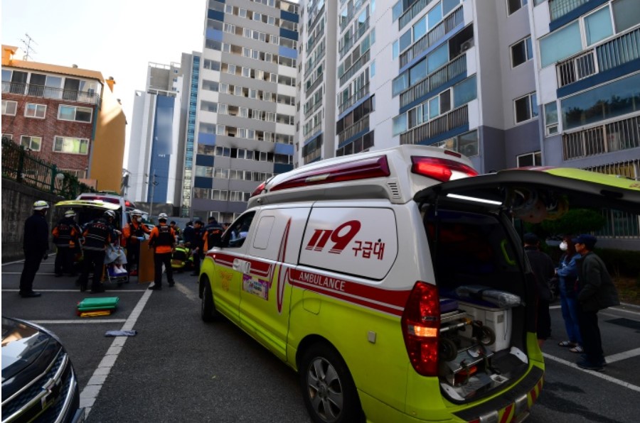 경북 포항시 북구 두호동 화재 현장에 신고를 받고 출동한 119구급대원들이 환자를 긴급이송하고 있다